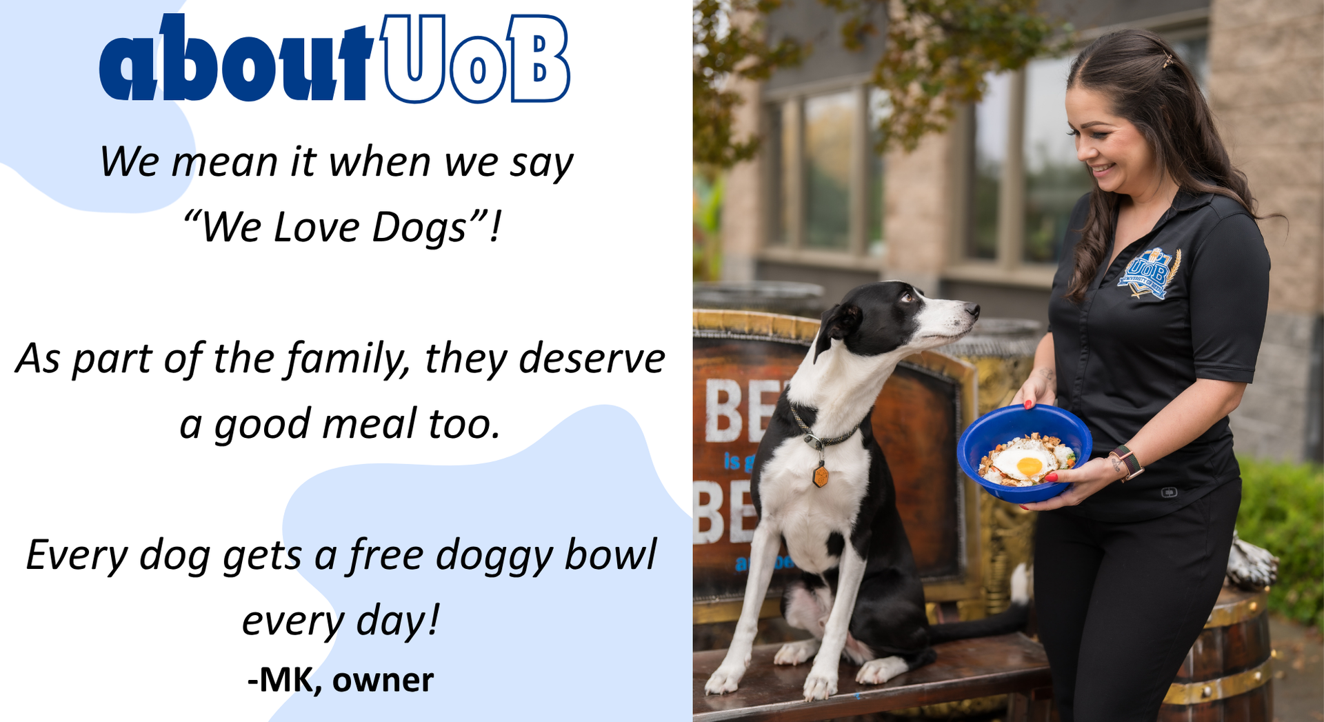 UOB's pup-friendly patios welcome dogs to join their owners, while our TVs always feature favorite sports channels and local team games. Join us for watch parties during big games to share the excitement.